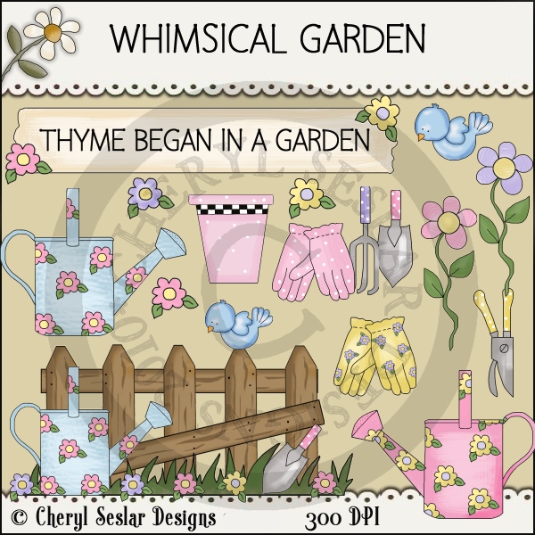 flower,garden,garden tools,bird,fence,cheryl seslar killian,whimsical inklings,embroidery,clip art,scrap,craft, card