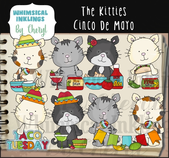 cat,kitten,kitttie,fiesta,cinco de mayo,taco,latino,cheryl seslar killian,whimsical inklings,embroidery,clip art,scrap,craft, card,diddybag.com