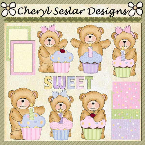bear,birthday,cupcake,candle,scrap,cheryl seslar killian,whimsical inklings,embroidery,clip art,scrap,craft, card,diddybag.com