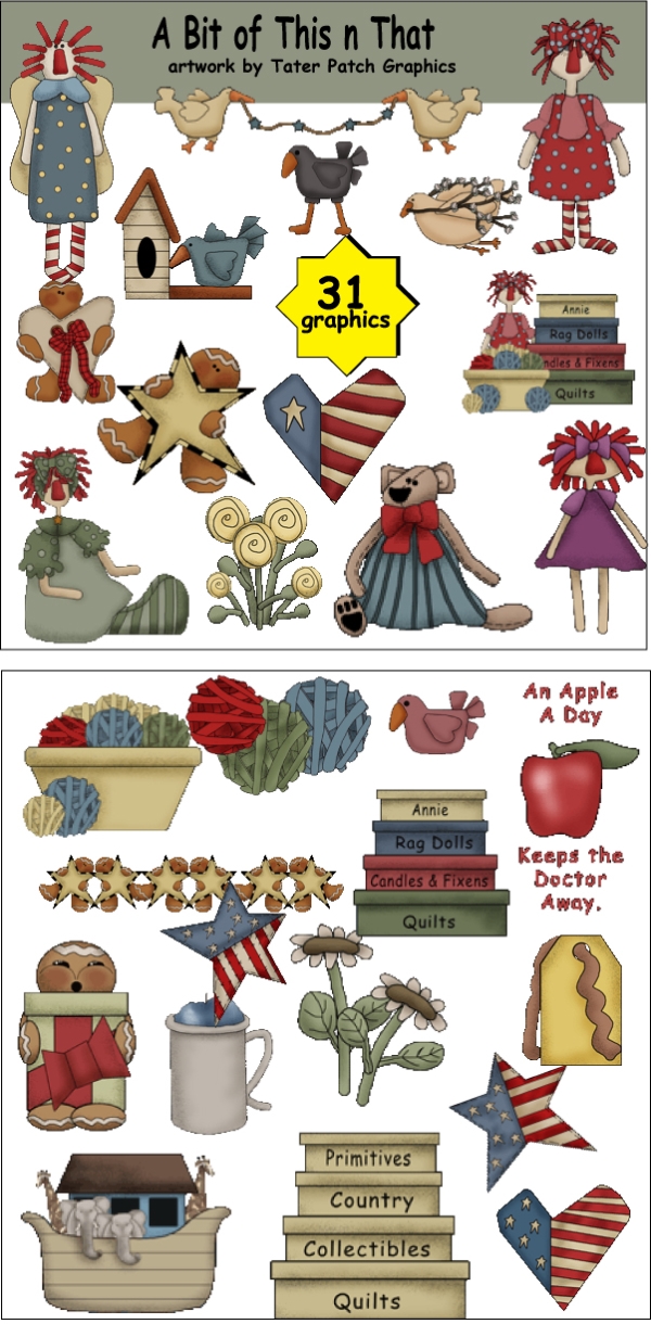 bear,bird,ginger,star,bear,box,yarn,ark,ginger,flower,raggedy,apple,prim,tater patch,alice smith, clip art, clipart